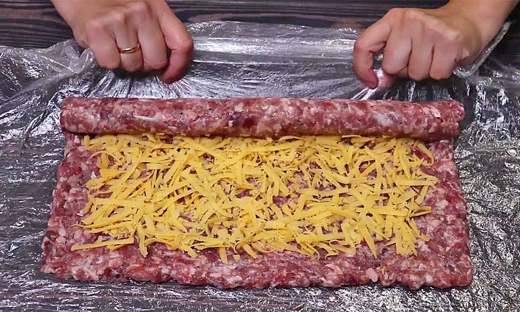 3. Равномерно распределите натертый сыр по всей поверхности фарша, оставляя небольшие края свободными, чтобы сыр не вытекал при заворачивании. Аккуратно поднимите пленку с одного конца и начните заворачивать фарш в рулет. Помогайте себе, подтягивая пленку, чтобы рулет получился плотным и ровным. Убедитесь, что края хорошо запечатаны, и рулет не развалится. Завяжите концы пленки, чтобы рулет не раскрылся во время заморозки.