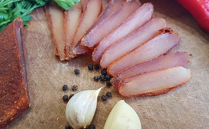 7. Через 2 дня ваша бастурма готова! Мясо станет плотным, сухим и ароматным. Нарежьте бастурму очень тонкими ломтями, так, чтобы она распадалась на кусочки, но сохраняла свою форму.