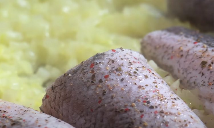 Минтай и хек при жарке дают слишком много запаха, а сочность напротив, теряют. Именно такие виды лучше готовить по-еврейски, в луковом соусе. Нежный хек, тушеный в карамелизированном луке с легкой кислинкой, станет настоящим украшением вашего стола.