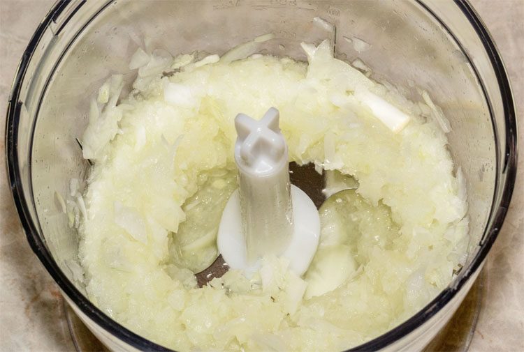 2. Нарежьте лук крупными кусками, чтобы его было удобно измельчать. В чашу блендера добавьте лук, яйца и чеснок. Взбейте ингредиенты до получения однородной массы. По желанию, можно добавить щепотку соли и немного специй в кляр.