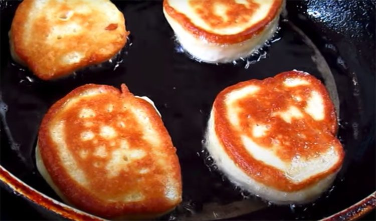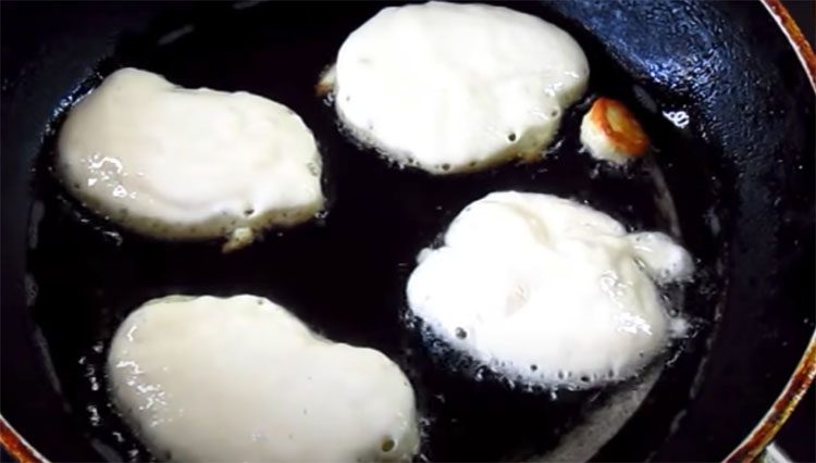 5. Разогрейте сковороду с растительным маслом на среднем огне. Когда масло разогреется, выкладывайте тесто ложкой, формируя небольшие оладьи. Жарьте их с обеих сторон до золотистой корочки — примерно по 2-3 минуты с каждой стороны. Не торопитесь, чтобы оладьи прожарились внутри. Готовность можно проверить, разрезав оладью. Если она внутри мягкая и пышная, значит, оладьи готовы.
