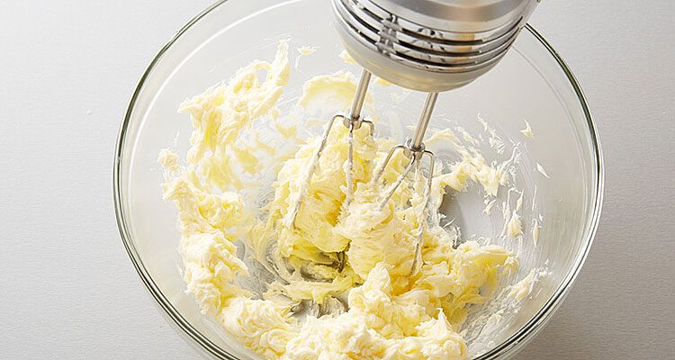 3. В отдельной миске взбейте сливочное масло с помощью миксера на высокой скорости до легкой, пушистой консистенции. Это займет около 2-3 минут. Масло должно стать мягким и воздушным.