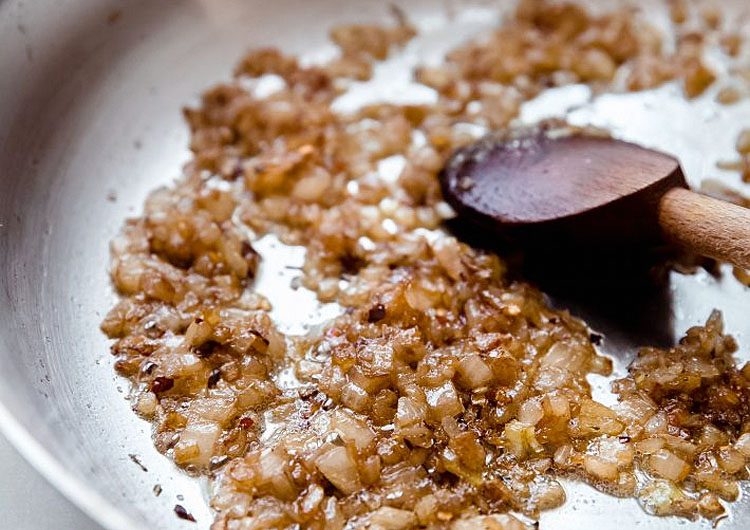 1. Разогрейте сковороду с 1 столовой ложкой масла от анчоусов (или оливкового масла) на среднем огне. Положите мелко нарезанный лук в сковороду и добавьте щепотку сахара. Сахар поможет ускорить процесс карамелизации и придаст луку золотистый цвет. Готовьте лук, постоянно помешивая, на среднем огне. Не спешите и не увеличивайте огонь, иначе лук может подгореть.