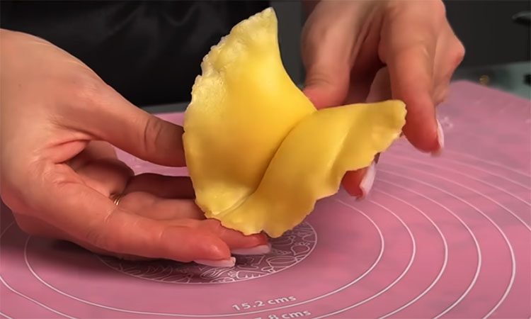 Затем при помощи шпажки или палочки для суши делаем углубление посередине печенья, чтобы получилось характерное «крылышко». Переносим заготовки на противень, застеленный пергаментом, и выпекаем в разогретой до 190°C духовке около 10-15 минут, пока печенье не подрумянится.