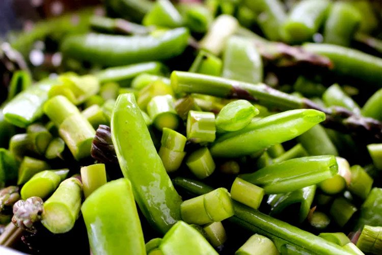 1. Нарежьте зеленый лук, мини-спаржу и стручки на небольшие кусочки. Лисички нарежьте крупными ломтями. В сковороду налейте оливковое масло и разогрейте его на среднем огне. Когда масло нагреется, добавьте грибы и обжаривайте их, помешивая, около 2-3 минут, пока они не станут мягкими и не начнут слегка золотиться. Затем добавьте в сковороду сахарный горошек, стручки, шпинат и зеленый лук. Обжаривайте все вместе, периодически помешивая, еще 3-4 минуты до мягкости, но при этом овощи должны сохранить свой цвет и свежесть. Готовый гарнир отложите в сторону, чтобы он не продолжал готовиться.