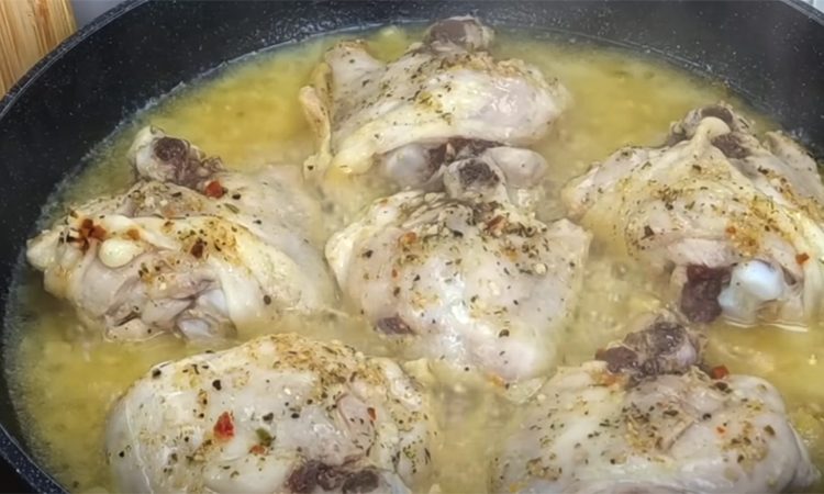 Нарежьте лук мелкими кубиками и обжарьте его на смеси растительного и сливочного масла до прозрачности. Добавьте пищевую соду, чтобы лук приобрел мягкую, пюреобразную текстуру и не пригорел. Затем добавьте куриные бедра, посыпьте их солью, овощной приправой и приправой для курицы, перемешайте и тушите на медленном огне около 15 минут.