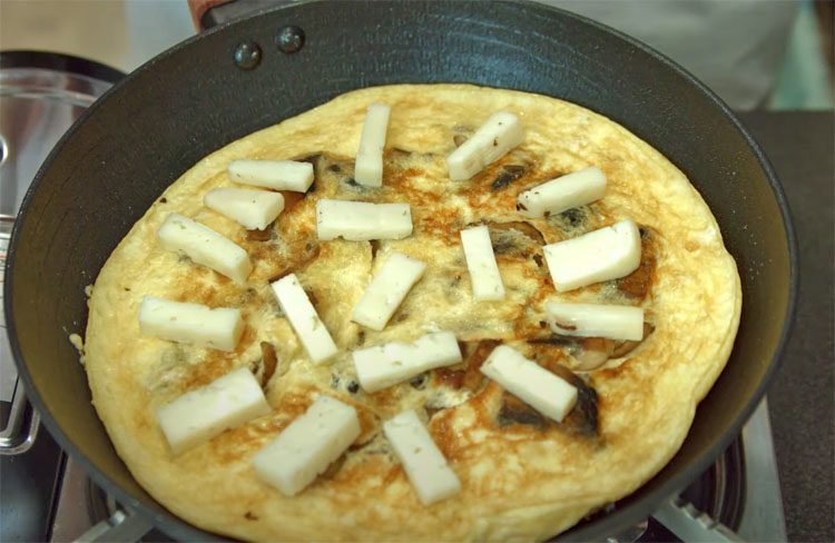 4. Осторожно переверните омлет на другую сторону. Выложите нарезанный на бруски сыр и снова накройте крышкой. Готовьте омлет еще 1-2 минуты, пока сыр полностью не расплавится.