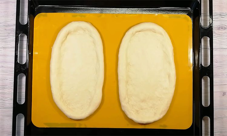 2. Обомните тесто, раскатайте и сформируйте «лодочки». Для этого разложите тесто на противне, а края аккуратно загните вверх, чтобы начинка не выпадала во время запекания.