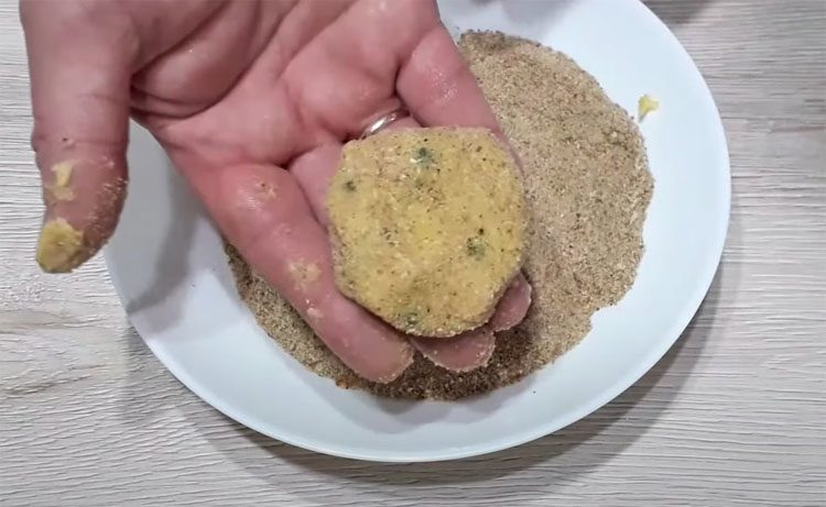 5. Возьмите небольшое количество картофельной массы и сформируйте из неё котлеты. Удобнее делать это мокрыми руками, чтобы масса не прилипала. Обваляйте каждую котлету в панировочных сухарях.