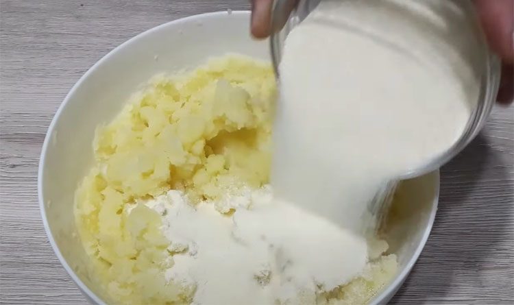 4. Разбейте два яйца в картофельную массу. Тщательно перемешайте смесь до однородного состояния. Оставьте массу на 30 минут. За это время манка окончательно набухнет, и масса станет более плотной.
