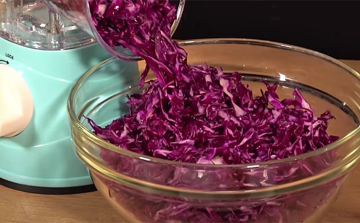 1. Очистите морковь и натрите её на крупной терке. Вымойте красную капусту, удалите верхние листья, нарежьте её на тонкие полоски, а затем нарежьте или нашинкуйте на более мелкие кусочки.