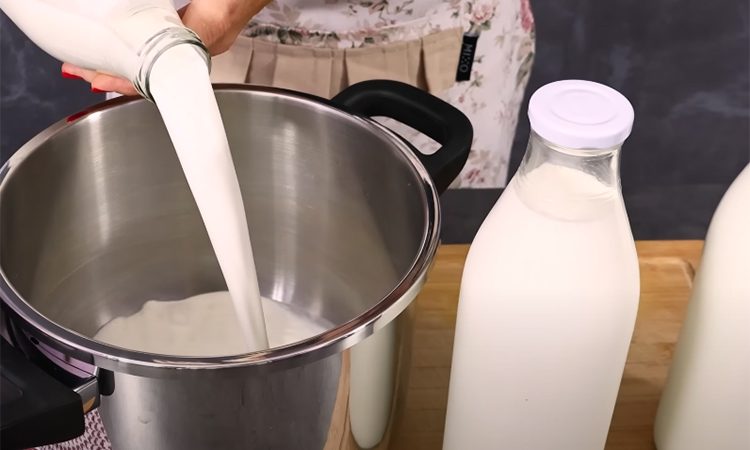 Свежее молоко вылейте в глубокую кастрюлю и поставьте на плиту. Доведите до кипения на среднем огне, периодически помешивая, чтобы молоко не пригорело. Как только оно закипит, варите еще 3 минуты, затем снимите с огня. Дайте молоку остыть до температуры около 40-45 градусов. Проверить можно кухонным термометром — оно должно быть теплым, но не горячим.