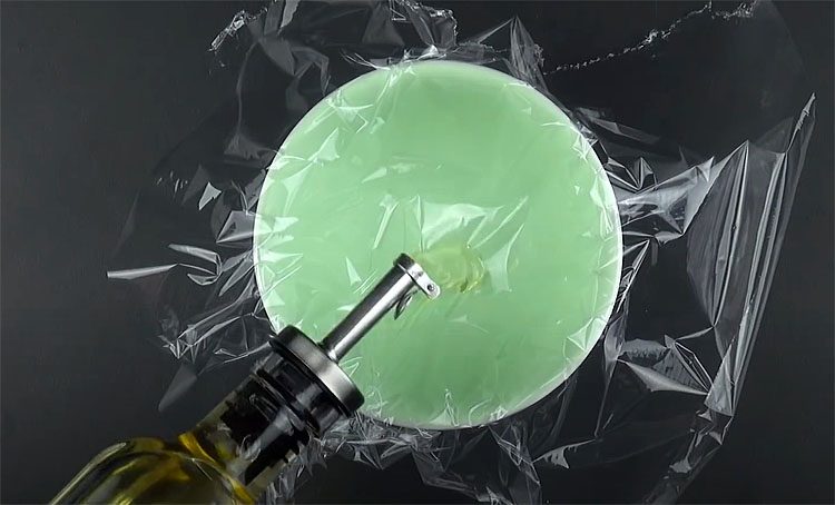1. Поместите лист пленки в чашку так, чтобы он немного свисал с краев. Это нужно для того, чтобы потом завязать пленку в мешочек. Налейте немного растительного масла.