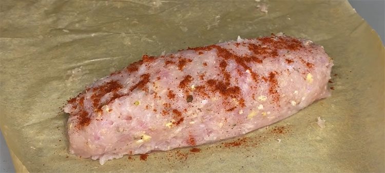 5. Плотно закрепите края рулета мокрыми руками, чтобы начинка не вытекала. Посыпьте рулет сладкой паприкой. Заверните сформированный рулет в тот же лист пергамента, скрутите края бумаги как у конфеты. Повторите процесс с оставшимся фаршем — из указанных ингредиентов получится 3 рулета.