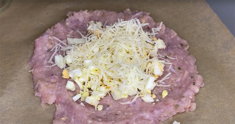 4. В центр круга положите нарезанные яйца ровным слоем. Сверху равномерно посыпьте яйца натёртым сыром. С помощью пергамента аккуратно сверните фарш в рулет.