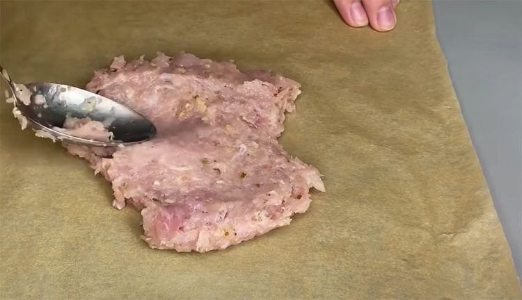 3. Постелите на рабочую поверхность лист пергаментной бумаги. Возьмите треть фарша и выложите его на бумагу. Смочите ложку водой, чтобы фарш не прилипал, и разровняйте его в форме большого круга толщиной около 1 см.