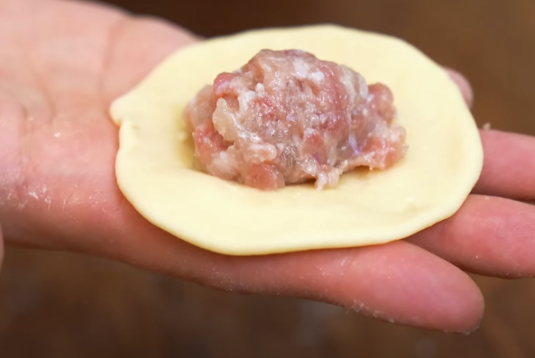 Пока тесто отдыхает, приготовьте начинку. Для сочного фарша смешайте 500 г свинины, 100 г сала, 200 г лука, половину чайной ложки соли, черный перец по вкусу и 70-80 мл холодной воды. Хорошо перемешайте фарш до однородности. После отдыха разделите тесто на порции по 70-80 г, накройте их миской, чтобы не подсыхали, и раскатайте каждую часть тонко. Благодаря плотной текстуре тесто легко раскатывается и не рвется, что делает его идеальным для пельменей.