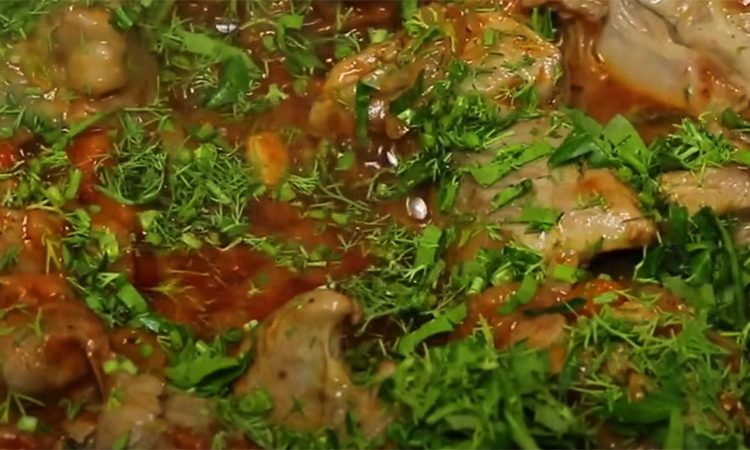 Нарежьте бедро индейки крупными кусками, обжарьте на раскаленном масле до золотистой корочки. Добавьте измельченный лук и сладкий перец соломкой, пассеруйте до мягкости. Введите раздавленный чеснок, томатную пасту, хмели-сунели, кориандр и паприку, перемешайте с мясом.
