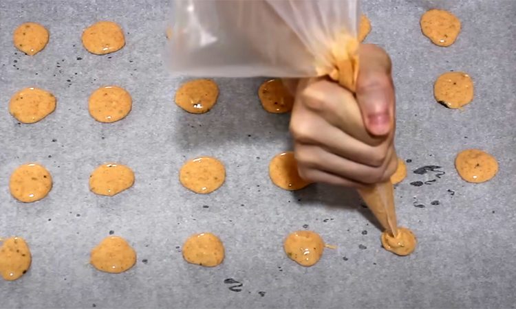 На противень с пергаментом выдавите небольшие порции, оставляя расстояние между заготовками. Накройте сверху пергаментом и придавите смесь стаканом, чтобы чипсы стали тонкими. Убедитесь, что заготовки не соприкасаются. Разогрейте духовку до 180 градусов и выпекайте чипсы 15–20 минут. После выпекания снимите верхний слой пергамента, дайте чипсам остыть.