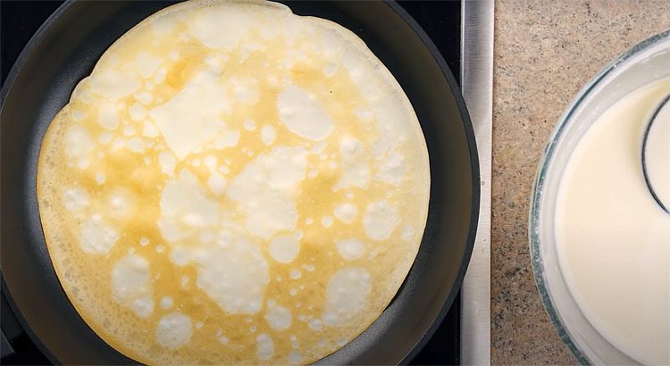 4. Когда сковорода разогрета, налейте немного теста и распределите его по поверхности сковороды, наклоняя её в разные стороны. Жарьте блин до тех пор, пока края не начнут подниматься и не станет видно, что он подрумянился (около 1 минуты). Переверните блин с помощью лопатки и жарьте с другой стороны до золотистого цвета. Это тоже займет несколько секунд. Повторяйте процесс с остальным тестом.