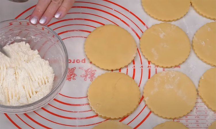 Влейте жидкую часть в сухую и быстро замесите тесто, стараясь не переусердствовать — как только ингредиенты объединятся в комок, остановитесь. Для начинки смешайте творог, сметану, сахар, муку и яичный белок, тщательно разотрите до однородности. Тесто раскатайте в пласт толщиной 6-8 мм, вырежьте круглые лепешки диаметром 9-10 см. На одну половину каждой лепешки выложите творожную начинку, равномерно распределите и аккуратно сложите тесто пополам, формируя открытые сочники.