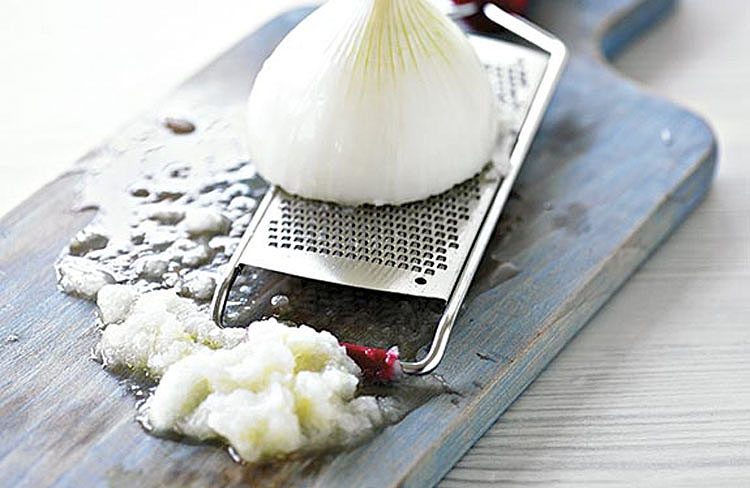 2. Лук очистить и натереть на мелкой терке, чтобы он равномерно распределился в фарше. В глубокой миске соединить мясную массу с натертым луком. Добавить соль, черный перец, майоран, мускатный орех и крахмал. Всыпать ледяную крошку (ее можно приготовить, измельчив лед в блендере). Тщательно перемешать руками или при помощи миксера с насадками для теста до получения однородной консистенции.