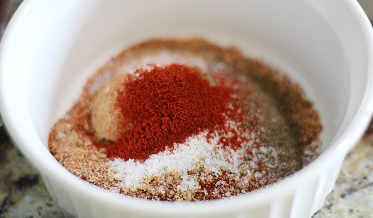1. В небольшой миске смешать соль, чёрный перец, кайенский перец и сахар.