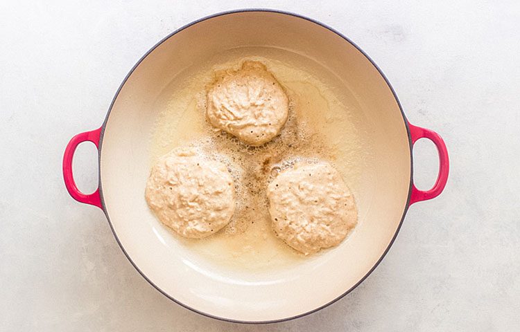 4. Разогрейте сковороду на среднем огне и смажьте её сливочным или растительным маслом (1,5 ч. л. сливочного или 1 ч. л. растительного). Выливайте тесто на сковороду, рассчитывая по 1/4 чашки на каждый оладушек. Жарьте их по 1-2 минуты с каждой стороны. Когда на поверхности оладьев начнут появляться пузырьки, аккуратно переверните их. Уменьшите огонь до средне-низкого и готовьте еще 1 минуту или до золотистой корочки. Переложите готовые оладьи на противень, который поставьте в разогретую до 100°C духовку, чтобы они оставались теплыми, пока готовится оставшееся тесто.