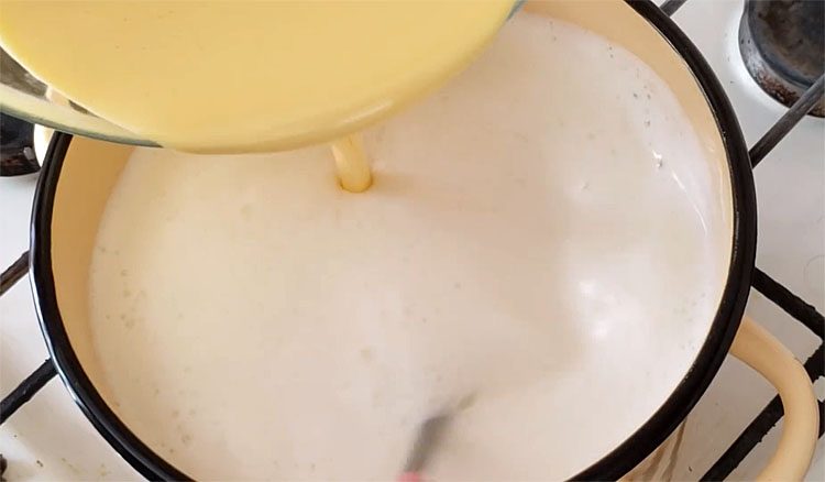 3. Когда молоко начнёт закипать, медленно влейте яично-сметанную смесь в кастрюлю с молоком, продолжая интенсивно помешивать, чтобы избежать образования комков. После того как вся смесь будет добавлена, уменьшите огонь до среднего.