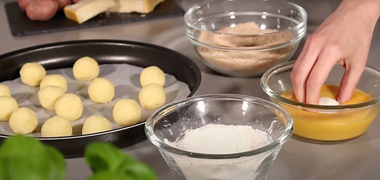 6. Каждый шарик аккуратно обваляйте сначала в муке, чтобы он не лип к рукам при последующих шагах. Затем обмакните в взбитые яйца, чтобы панировка хорошо прилипла. После этого обваляйте шарик в панировочных сухарях. Для дополнительного хруста можно повторить этот шаг: снова обмакнуть в яйцо и снова в сухари.