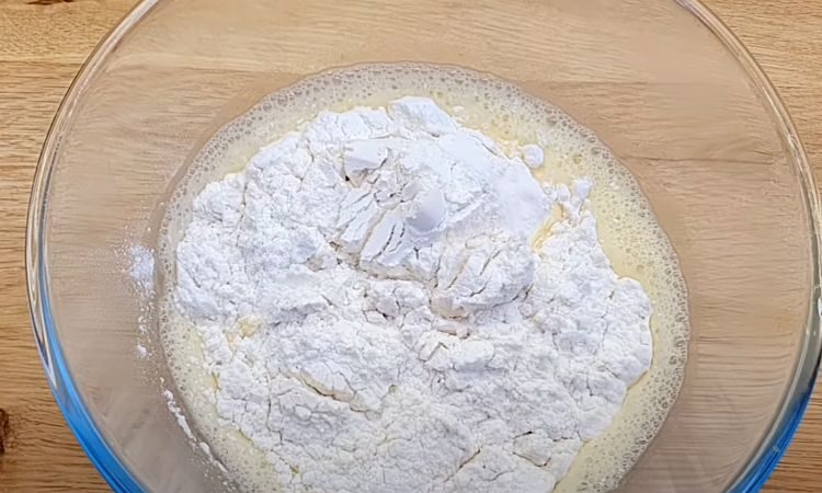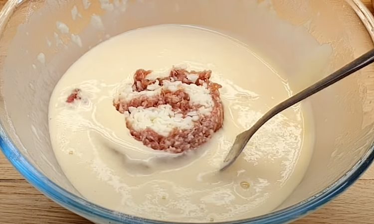 3. В отдельной миске разбиваем 2 яйца, добавляем 150 мл молока и тщательно перемешиваем венчиком или вилкой до однородной массы. Постепенно добавляем 200 г муки, продолжая перемешивать, чтобы не образовывались комки. Масса должна быть довольно густой, но в то же время легко обмакиваться.