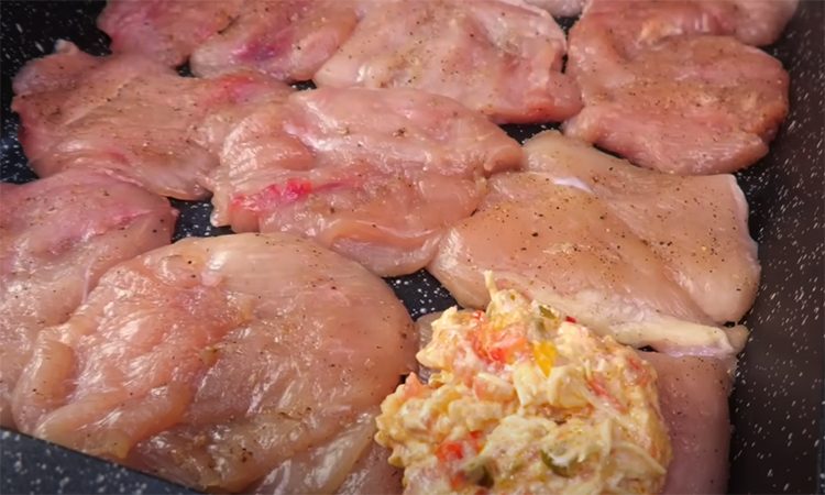 Начинку распределите поверх каждого кусочка курицы, оставляя края свободными, чтобы мясо не потеряло форму при запекании. Сверху посыпьте оставшимся сыром. Отправьте противень в духовку на 15–25 минут. Курица приготовится быстро, а сырная корочка подрумянится.