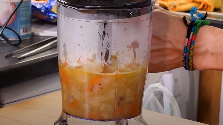 5. Когда овощи станут мягкими, аккуратно переложите суп в блендер. Лучше делать это порционно, чтобы не перегрузить блендер. Легко пюрируйте суп до желаемой консистенции. Главное, чтобы в супе остались небольшие кусочки овощей, а не получилось полностью пюреобразное состояние. Это придаст супу текстуру и насыщенность.