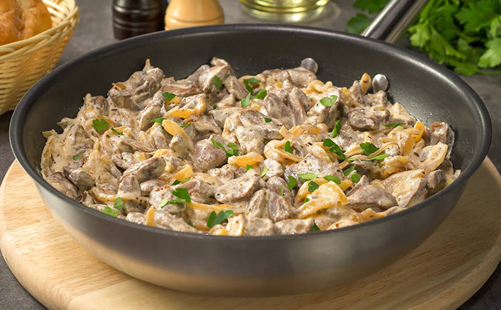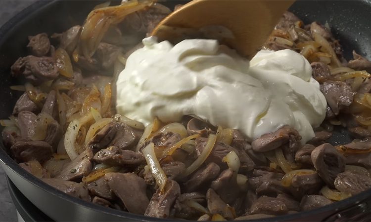 Для заправки соединяем сметану с холодной водой в равных пропорциях, добавляем горчицу, соль, перец и крахмал. Всё перемешиваем до однородности и вливаем в сковороду, постоянно помешивая, чтобы не было комков. Доводим до кипения, но не кипятим — соус должен загустеть и обволакивать каждое сердечко. Сразу подаём к столу.