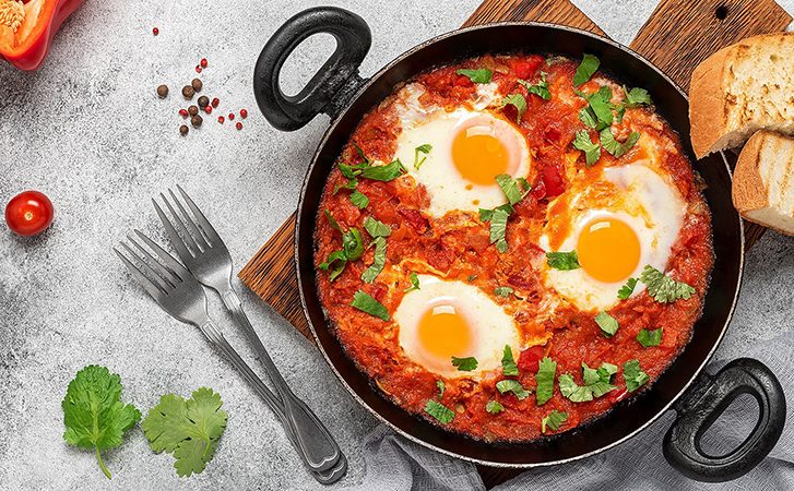 Яичница, которая готовится всего за 10 минут, но даёт насыщенный вкус и держит сытость на весь день. В её основе обжаренные овощи, специи, ароматная зелень и яйца. Летом можно использовать свежие томаты, зимой – помидоры в собственном соку. Благодаря базилику, чесноку и аджике вкус получается насыщенным, а текстура нежной.