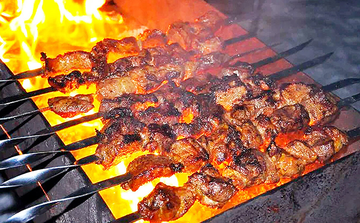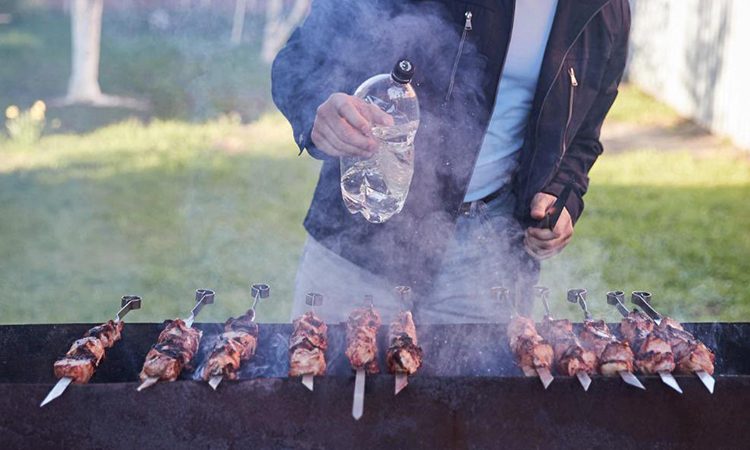 Пар от нее размочит мясо и некоторое время шашлык будет не жариться, а вариться. Кроме того, стабильность температуры также нарушится. Вместе с паром от воды к мясу поднимется зола, а шашлык с привкусом сажи не нравится никому. Что делать вместо обрызгивания? Просто быстро отодвиньте шампуры в сторону или поднимите их выше, дождитесь, пока огонь утихнет.