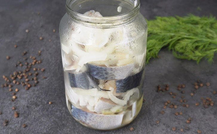 Уложите рыбу слоями в стеклянную банку, полейте растительным маслом, закройте крышкой и встряхните. Уберите в холодильник ещё на пару часов или до следующего дня.