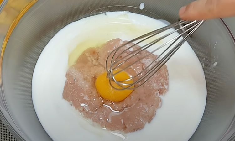 1. В глубокую миску вылейте кефир. Добавьте к нему мясной фарш и перемешайте, чтобы он равномерно распределился. Разбейте яйцо, всыпьте соль и соду, затем хорошо взбейте венчиком или вилкой, чтобы масса стала однородной и легкой.