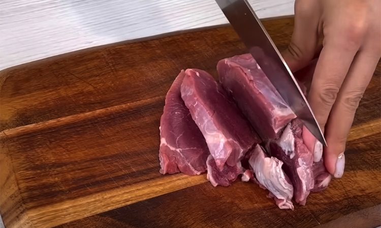 Мясо нарежьте брусочками, лук — полукольцами. В кастрюле с толстым дном разогрейте масло, обжарьте мясо с луком до лёгкой румяности. Пока всё жарится, нарежьте морковь соломкой, перец — крупными кусками, сельдерей — дольками. Введите в мясо томатную пасту и специи, хорошо прогрейте, затем влейте немного воды и дождитесь кипения.