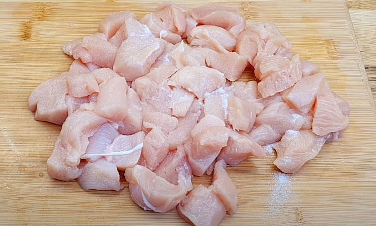 1. Хорошо промойте куриное филе под проточной водой и обсушите бумажными полотенцами. Нарежьте мясо небольшими кубиками (примерно 2×2 см). Переложите кусочки курицы в форму для запекания.