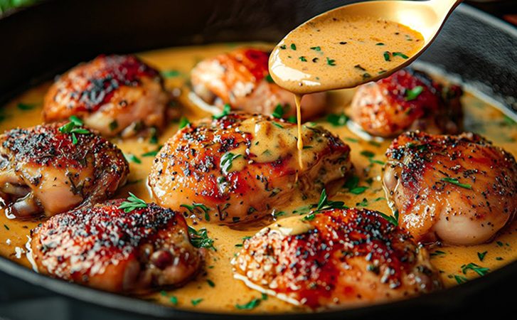 Курицу натрите солью, перцем, паприкой и дижонской горчицей. Разогрейте сковороду с толстым дном, растопите сливочное масло и обжарьте бёдра кожей вниз до золотистой корочки — 5–7 минут. Переверните и обжарьте ещё 2–3 минуты, затем переложите на тарелку. Повторите то же с голенями, подрумянив их со всех сторон. В этой же сковороде обжарьте мелко нарезанный шалот до мягкости, влейте белое вино, дайте алкоголю выпариться, затем добавьте куриный бульон, тимьян и лавровый лист.