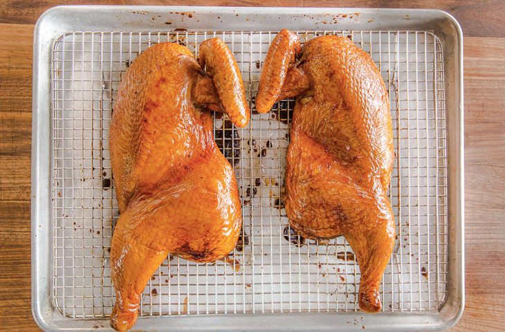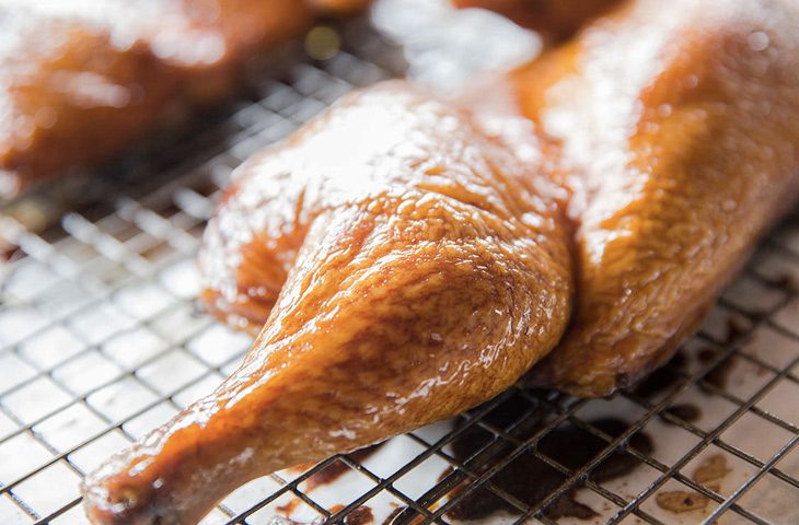 6. С помощью силиконовой кисточки покройте обе половинки курицы тонким, но равномерным слоем глазури — уделите внимание кожице и мясу. Поставьте курицу на решетке в холодильник на 24–48 часов. Лучше накрыть ее фольгой или пищевой пленкой (не плотно!), чтобы не обветрилась, но при этом «дышала».