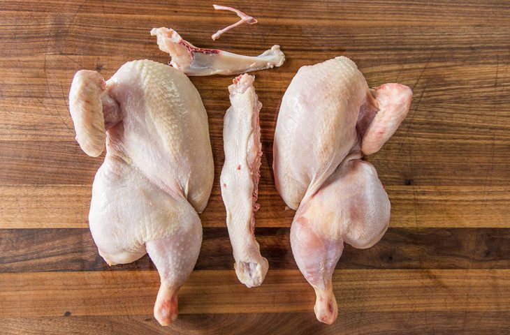 3. Выложите курицу на разделочную доску грудкой вверх. Сначала удалите вилочковую кость — она находится между грудками, у основания шеи. Затем аккуратно вырежьте грудную кость, не повреждая кожицу. Переверните курицу и срежьте позвоночник (можно использовать кухонные ножницы). Разделите тушку на две симметричные половины.