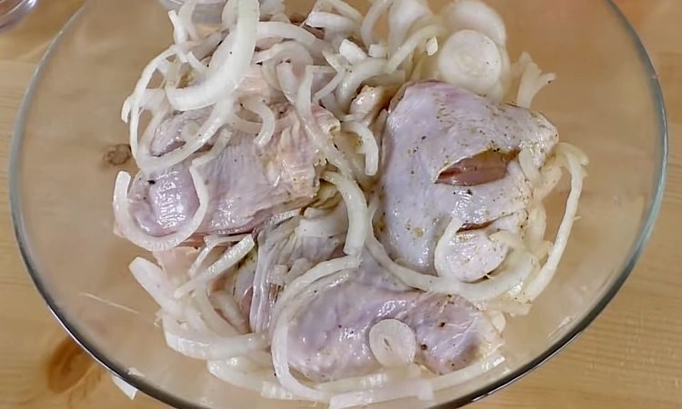 2. В глубокой миске смешайте нарезанный на полукольца лук, хмели-сунели, щепотку сахара, соль и перец по вкусу. Добавьте немного винного уксуса — он придаст кислинку, которая подчеркнет вкус курицы. В маринад положите подготовленные куриные окорочка. Разминайте руками, чтобы специи и лук равномерно покрыли мясо. Переложите курицу с маринадом в миску и накройте пленкой. Оставьте мариноваться в холодильнике минимум на 2 часа. Для лучшего вкуса можно оставить курицу на ночь.