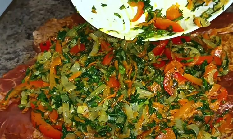 Нарежьте сладкий перец, добавьте его к овощам и жарьте еще 2 минуты. Снимите сковороду с огня, мелко нарежьте свежую зелень и перемешайте с овощами. Дайте начинке остыть. Выложите начинку на мясной пласт, распределяя равномерно. Аккуратно сверните рулет, подтягивая мясо, чтобы начинка осталась внутри. Перевяжите рулет ниткой, переложите в рукав для запекания.