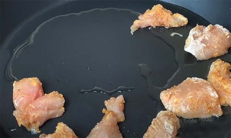 Куриное филе нарежьте средними кубиками, посолите, приправьте перцем и паприкой, тщательно перемешайте. Добавьте 2 столовые ложки муки, снова перемешайте. Разогрейте сковороду с растительным маслом и обжарьте мясо до румяной корочки с двух сторон, затем снимите со сковороды.