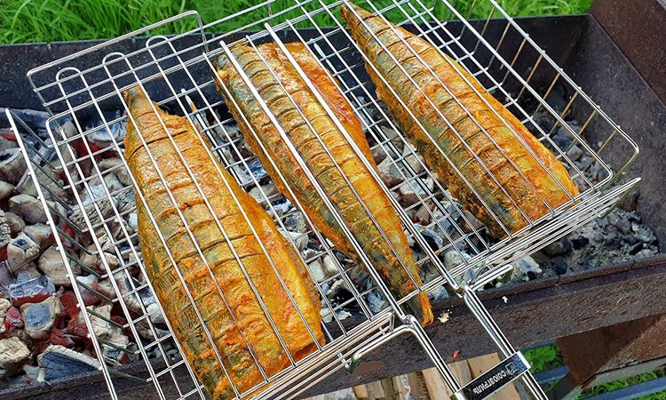 Выложите рыбу в решётку и жарьте над углями, регулярно переворачивая, чтобы избежать подгорания от капающего жира. Время приготовления — около 20 минут с каждой стороны до румяной корочки.
