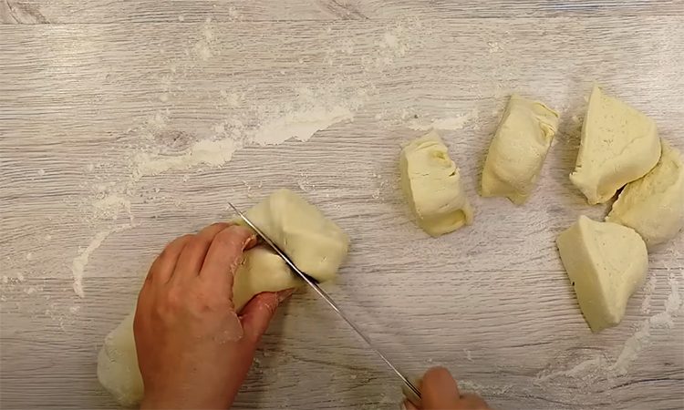 В миске соедините творог, соль, сахар, яйца и масло. Взбейте до однородности, затем всыпьте муку с разрыхлителем и замесите мягкое, слегка липкое тесто. Разделите тесто на две части, каждую — на пять кусочков. Раскатайте каждый кусочек в прямоугольник, смажьте маслом.
