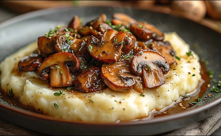 Посыпьте тимьяном или розмарином, перемешайте и доведите до слабого кипения. Разведите кукурузный крахмал в небольшом количестве холодного бульона, влейте в сковороду и готовьте еще 1-2 минуты, пока соус не загустеет и не станет кремовым. Подавайте блюдо, выложив порцию теплого картофельного пюре на тарелку, сверху щедро добавив грибное рагу.