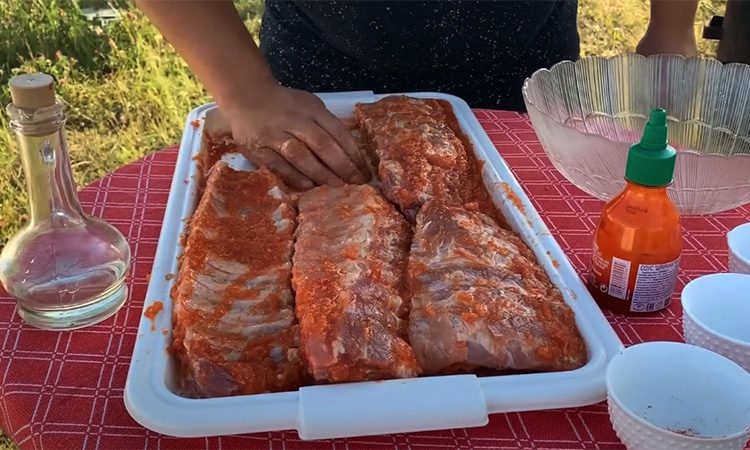 Без правильного маринада ребрышки на мангале почти всегда пересушиваются. Проблема решается просто: мясо нужно натереть смесью острого домашнего соуса, лука и помидоров. Такой маринад будет действовать почти как аджика, но не придаст мясу ненужных оттенков вкуса. Он сохранит весь сок внутри и сформирует на ребрышках аппетитную хрустящую корочку.